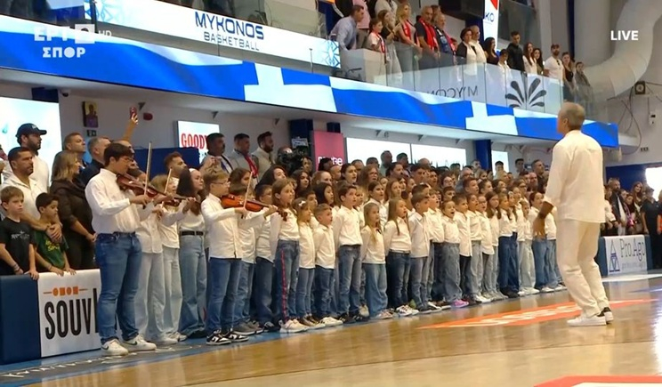 Μύκονος - Ολυμπιακός: Παιδιά από το μουσικό σχολείο Μυκόνου ψάλλουν τον Εθνικό ύμνο