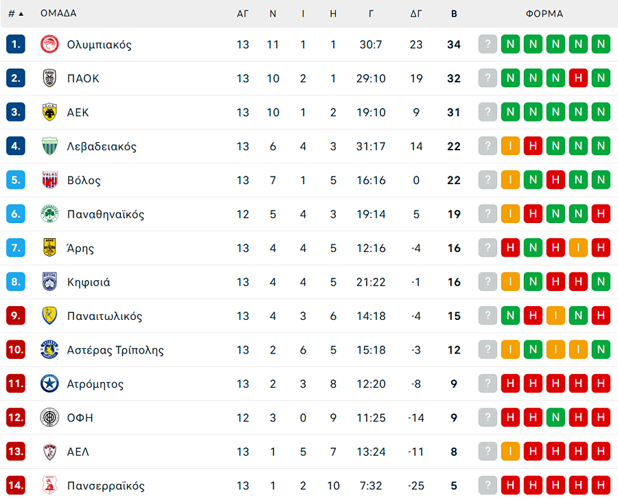 Στα υπόλοιπα παιχνίδια της 13ης αγωνιστικής, ο Παναθηναϊκός έχασε δύο ακόμη βαθμούς στις καθυστερήσεις από την ΑΕΛ, ενώ ισόπαλες ολοκληρώθηκαν και οι συναντήσεις του Αστέρα Τρίπολης με τον Λεβαδειακό και του Βόλου με την Κηφισιά. Τέλος, στο ματς της Δευτέρας που έκλεισε την αυλαία του πρώτου γύρου, ο Παναιτωλικός πήρε διπλό «ανάσα» απέναντι στον Πανσερραϊκό.