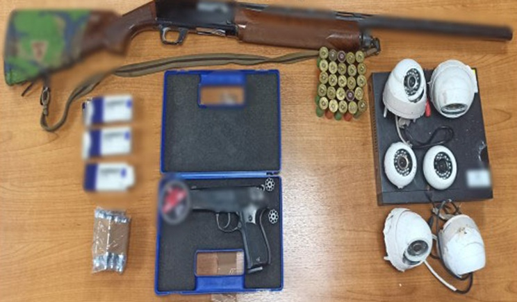 Κατόπιν αυτού, κατελήφθη ο κατηγορούμενος εντός της οικίας του, να κατέχει ναρκωτικά δισκία φαρμακευτικού σκευάσματος, καθώς και όπλα και πυρομαχικά, ενώ διαπιστώθηκε ότι είχε εγκαταστήσει έξωθεν της οικίας του -6- κάμερες κλειστού κυκλώματος.