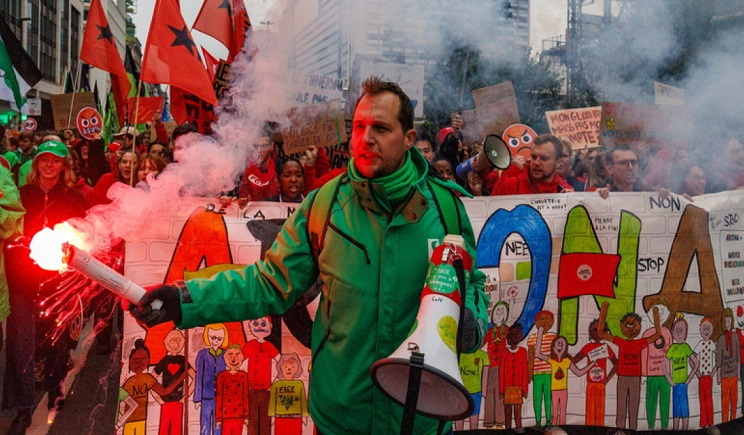 Μεγάλη είναι η προσέλευση των διαδηλωτών. Σύμφωνα με τα συνδικάτα, πάνω από 100.000 άνθρωποι διαδηλώνουν από το πρωί στους δρόμους των Βρυξελλών (80.000 σύμφωνα με την αστυνομία) κατά των μέτρων λιτότητας της κυβέρνησης συνασπισμού που θέλει να περιορίσει τα επιδόματα ανεργίας σε δύο χρόνια και να εφαρμόσει μια ευρεία μεταρρύθμιση των συντάξεων. Η βελγική κυβέρνηση συνασπισμού δρομολογεί επίσης σημαντικές περικοπές στον κρατικό προϋπολογισμό του 2026, η παρουσίαση του οποίου αναβλήθηκε για την επόμενη εβδομάδα. Τα αιτήματα που προβάλλουν τα τρία μεγάλα συνδικάτα (CSC, FGTB και CGSLB) είναι κυρίως κοινωνικοοικονομικά: ποιοτικές θέσεις εργασίας και δίκαιες συντάξεις.