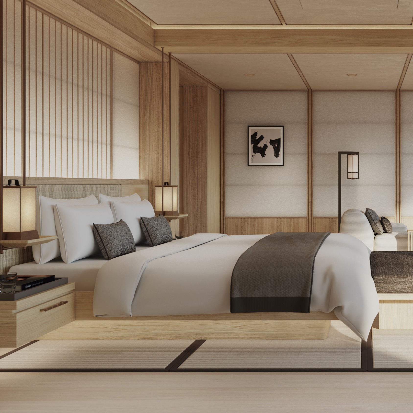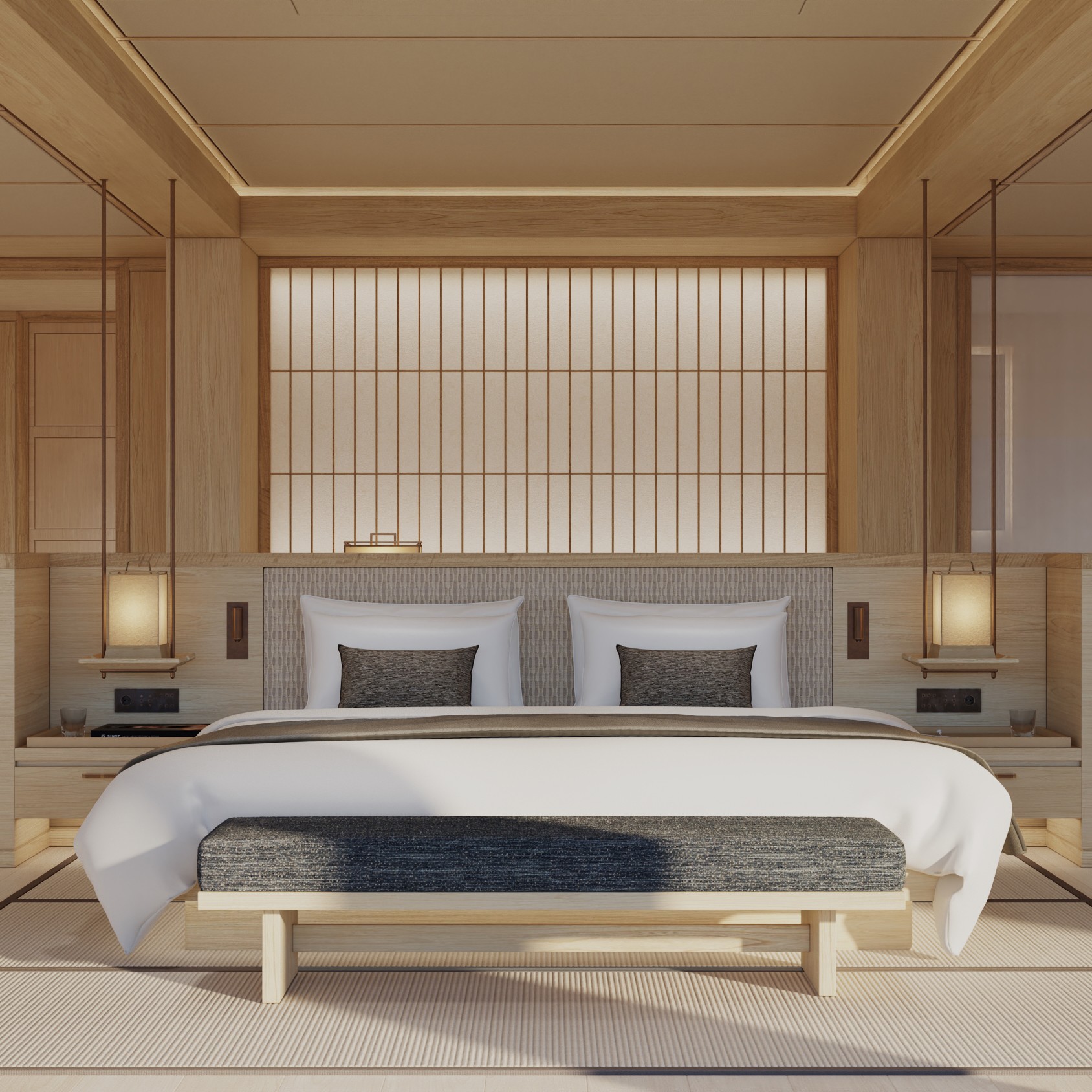 Οι 47 ευρύχωρες σουίτες του σκάφους έχουν σχεδιαστεί με βάση την παραδοσιακή ιαπωνική αισθητική Ryokan.
