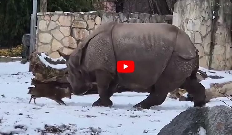 Ο ρινόκερος προσπάθησε να ξεπεράσει αυτό το… δύσκολο εμπόδιο πηγαίνοντας αριστερά και δεξιά, καθώς δεν ήθελε να του κάνει κακό. Προσπάθησε να το τρομάξει και να φύγει κάνοντας κίνηση προς το μέρος του, αλλά το ατρόμητο ελαφάκι επέμεινε και στο τέλος νίκησε, καθώς ο ρινόκερος απομακρύνθηκε.