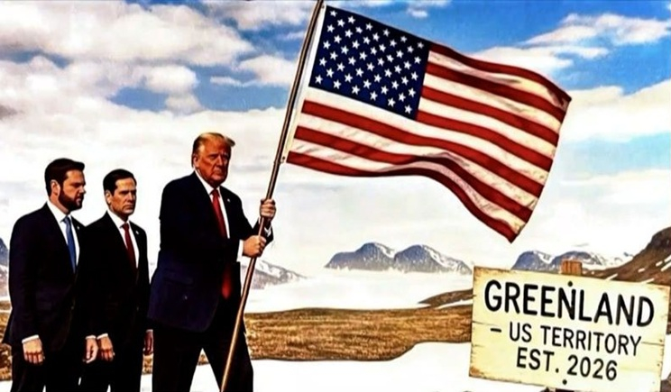 Παράλληλα με τη βοήθεια του ΑΙ εμφανίζεται σε φωτογραφία να τοποθετεί μια μεγάλη αμερικανική σημαία δίπλα σε μια πινακίδα που γράφει «ΓΡΟΙΛΑΝΔΙΑ – ΕΔΑΦΟΣ ΤΩΝ ΗΠΑ». Η Ευρώπη προετοιμάζει απάντηση στις απειλές για τους δασμούς του Αμερικανού προέδρου.