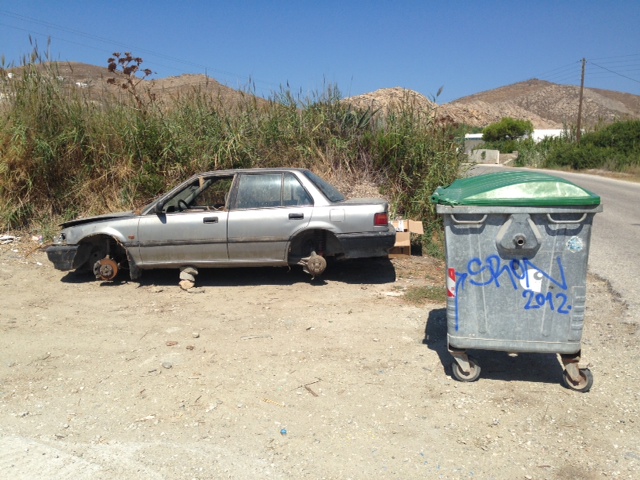 Τόσο απλά, τόσο συμβατικά, με ένα τέτοιο μεγαλείο κοινής λογικής και ρεαλιστικής προσέγγισης θα πρέπει να σκέφτηκε ο συμπολίτης μας που άφησε το ημικατεστραμμένο αυτοκίνητό του δίπλα σε κάδο απορριμμάτων στο δρόμο προς τις Κολυμπήθρες.