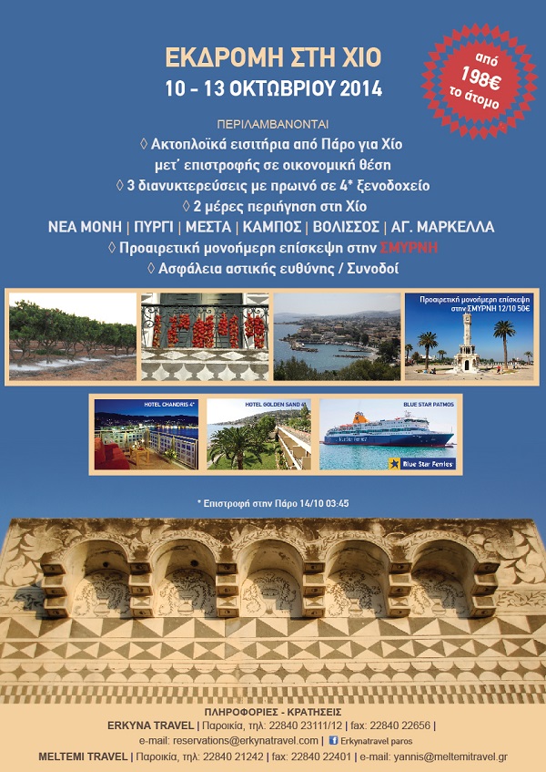 MELTEMI TRAVEL (Παροικία, τηλ. 22840 21242, fax: 22840 22401, e – mail: Αυτή η διεύθυνση ηλεκτρονικού ταχυδρομείου προστατεύεται από τους αυτοματισμούς αποστολέων ανεπιθύμητων μηνυμάτων. Χρειάζεται να ενεργοποιήσετε τη JavaScript για να μπορέσετε να τη δείτε.