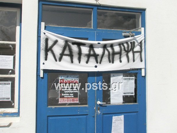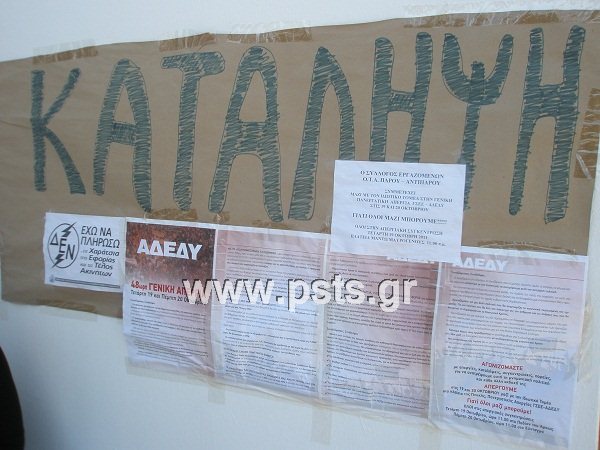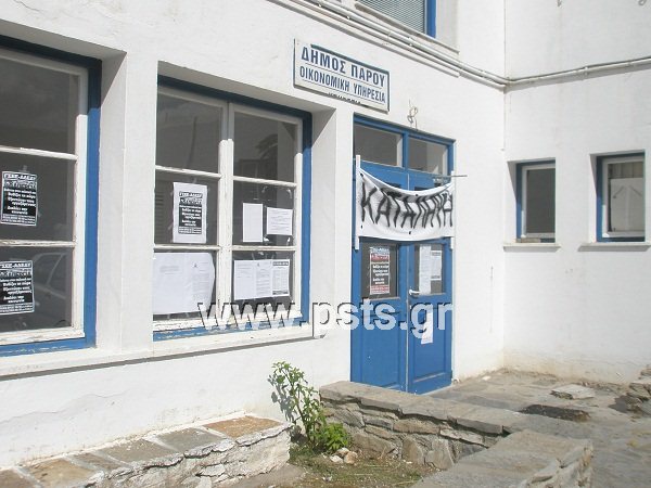 Το δημαρχείο της Πάρου κατέλαβαν από χθές το πρωί οι εργαζόμενοι στην τοπική αυτοδιοίκηση, οι οποίοι αντιδρούν στην εργασιακή εφεδρεία και τα κυβερνητικά μέτρα.