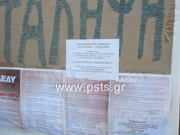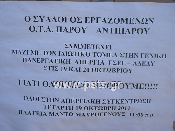 Ο σύλλογος εργαζομένων ΟΤΑ Πάρου - Αντιπάρου συνεχίζει τις κινητοποιήσεις και συμμετέχει μαζί με τον ιδωτικό τομέα στη Γενική Πανεργατική Απεργία ΓΣΕΕ - ΑΔΕΔΥ στις 19 και 20 Οκτωβρίου