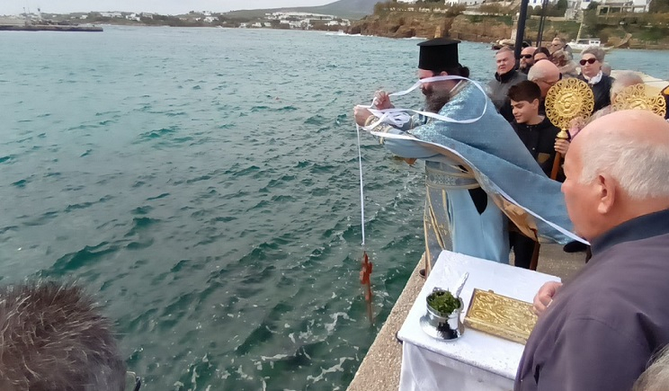 Τελέστηκε ο καθιερωμένος Αγιασμός των Υδάτων στο λιμάνι και έγινε η ρίψη του Τιμίου Σταυρού στη θάλασσα. Επτά άτομα βούτηξαν για να τον ανασύρουν, τυχερή και ευλογημένη, σύμφωνα με την παράδοση, ήταν η Μικαέλα Χατζηαθανασίου που τον έπιασε πρώτη.
